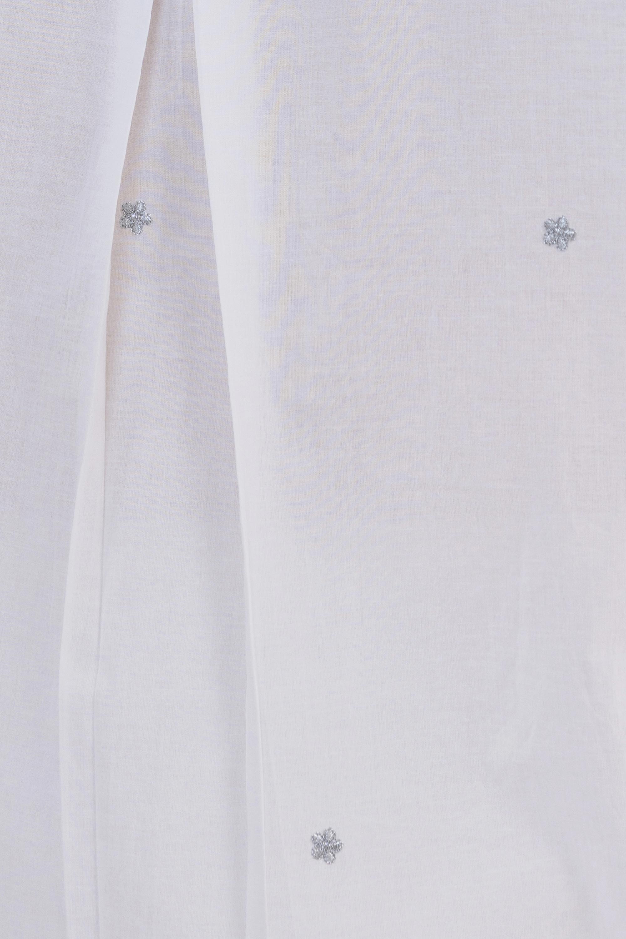 We love all things shiny. This dressy cotton shirt has tiny silver lurex flowers running through it with lace detailing. It is perfect for a day at work or a lunch with friends. Made with 100% cotton, it feels light and breathable on the skin. The flower embroidery is inspired by the millions of twinkling stars in the sky, uniting the sky and earth energies.