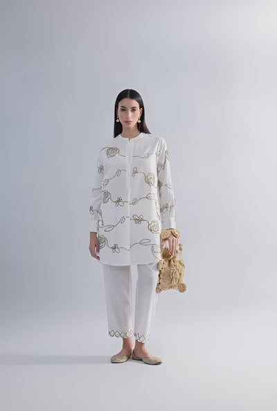 This straight cut tunic is made with the finest cotton and has a custom gota embroidery running all over all over. This chic tunic is perfect for any festive occasion. Made with pure cotton, it feels light and breathable on the skin. The gota design has flowers and paisley running in it, this floral bel is inspired from spring gardens giving your wardrobe the delicate scent of luxury and passion.