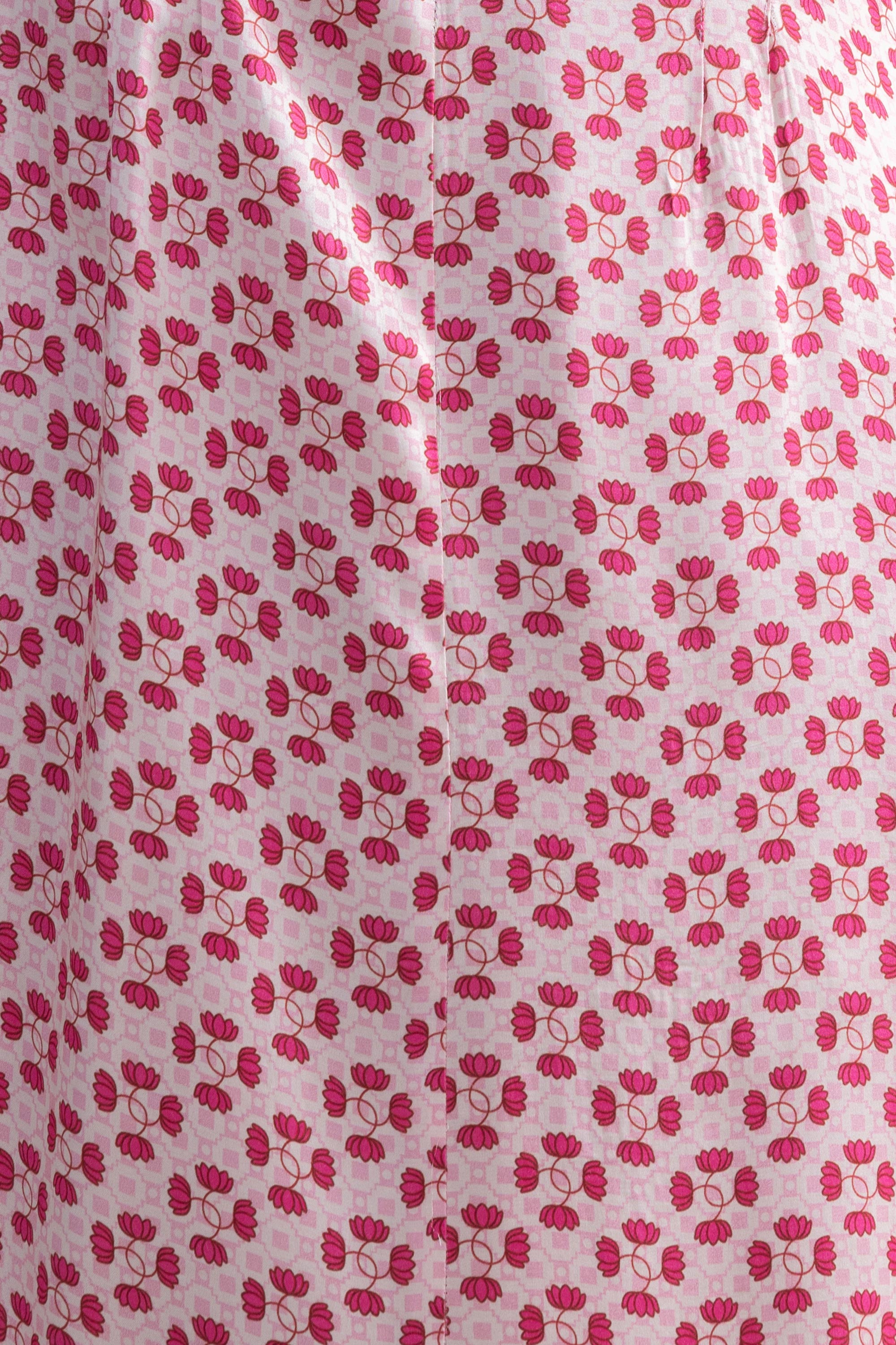 This formal fitted dress with its beautiful scallop hemline is wonderful for any formal occasion. Team it with a pair of pants or on its own. The Hampi print is inspired from the town of Hampi in Karnataka, India. Elements from the architecture, landscape and history of this historic city constitute this print. The lotus flower running through the print is the national flower of the state.